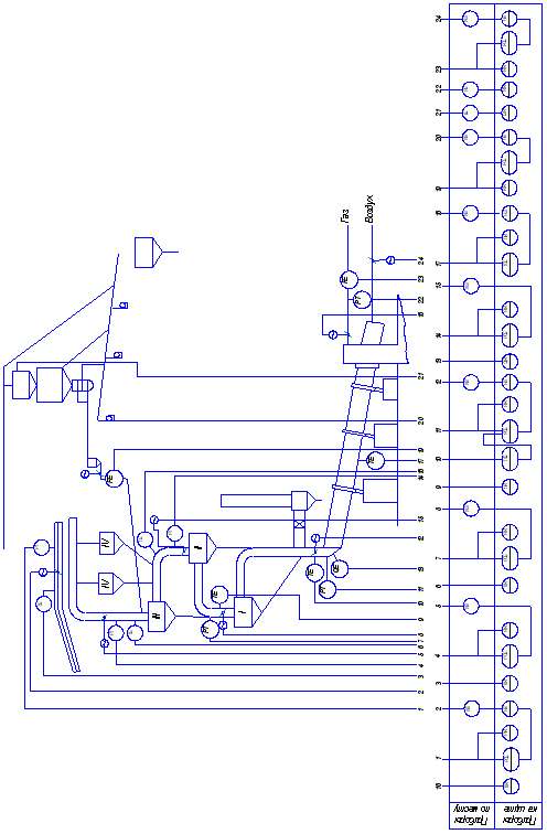 После охлаждения клинкера часть нагревшегося в холодильнике воздуха поступает в печь, а часть, пройдя очистку в аспирационной установке, сбрасывается через выхлопную трубу. Осажденная в аспирационной камере пыль по течке поступает на клинкерный конвейер. Тепло выходящих из печи газов используют в циклонных теплообменниках. После циклонных теплообменников дымовые газы проходят осадительные циклоны и электрофильтры, в которых очищаются от пыли, и далее выбрасываются через дымовую трубу в атмосферу. Пыль из циклонов подается в печь шнеками, а из электрофильтров - пневмонасосами либо в отделение смесительных силосов, либо в печь. В печи с циклонными теплообменниками имеются механизмы следующих трех групп: механизмы питания печи сырьевой мукой, обжига и охлаждения; тягодутьевые механизмы и механизмы пылеулавливания и транспортирования уловленной пыли. Для управления этими механизмами предусматривается дистанционное управление с блокировкой со щита машиниста печи, являющееся основным видом управления. И местное управление (без блокировки), которым пользуются только при проведении наладочных и ремонтных работ. На период розжига печи предусмотрено деблокированное управление отдельными механизмами печного агрегата (в том числе главным приводом печи и вентилятором первичного воздуха). С деблокированного управления на блокированное переводят на ходу без остановки механизмов. Работа главного привода печи сблокирована с работой системы смазки. Вспомогательный привод печи используют только при ремонтных работах. Для него применено местное управление.