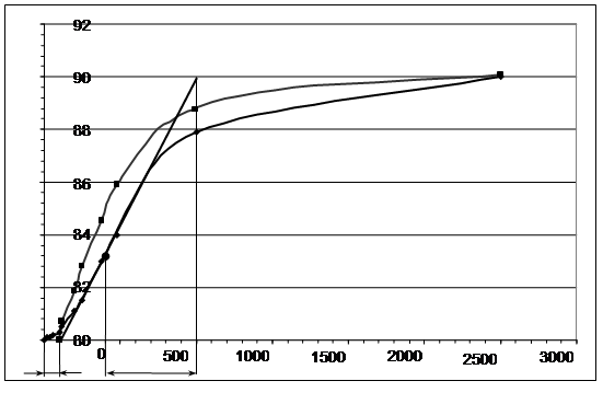 Строим кривую разгона, заданную табл. 2. Эквивалентная кривая разгона представляет собой экспоненту с запаздыванием τ. По формуле