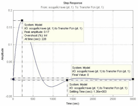Таким образом, в дальнейших расчетах используем эквивалентный объект, описываемый дифференциальным уравнением 1-го порядка с самовыравниванием и запаздыванием со следующей передаточной функцией: