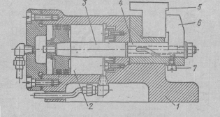 Пневматические тиски конструктивно отличаются от обычных параллельных тисков. Здесь пневмомеханизм смонтирован на базе корпуса 1 (рис.2). Губки 6 укреплены на штоке 3 цилиндра, поэтому они расходятся на величину хода поршня пневмоцилиндра 2, На цилиндрической части 4 губки сделан паз по винтовой линии, в который входит конец винта 7. Таким образом, когда поршень под давлением сжатого воздуха перемещается слева направо, губка 6 не только отходит, но и поворачивается на 90', освобождая место для установки детали (или сборочной единицы) 5. При обратном ходе поршня эта губка также сначала поворачивается в прежнее положение, а затем зажимает деталь (или сборочную единицу) 5.