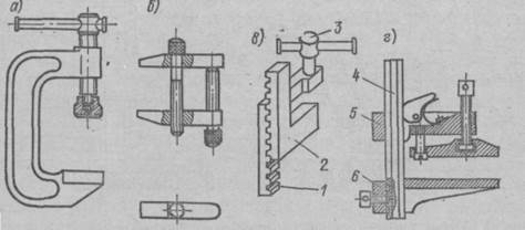 Рис. 3. Струбцины: а, б - с винтовым зажимом; в - быстродействующая разборная с зубчатыми полускобами; г - струбцина-домкрат.