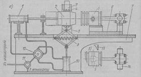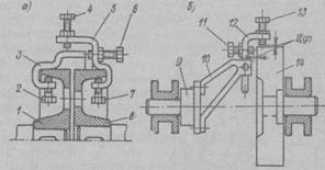 Контролю при сборке машины подвергается, например, центрирование осей валов сопрягаемых сборочных единиц. Некачественное центрирование приводит к вибрации машины, расшатыванию подшипников, нагреву их и, следовательно, преждевременному выходу машины из строя или аварии. Для проверки центрирования применяют специальную оснастку и приспособления. Два таких приспособления показаны на рис.9. Первое приспособление (рис. 9, а) состоит из скоб 3 и 5, закрепляемых перед центрированием болтами 2 и 7 к полумуфтам 1 и 8 валов. Радиальные зазоры измеряют между плоскостью скобы 3 и торцом контрольного болта 4, торцовые зазоры - между торцом скобы 3 и торцом контрольного болта 6. Измерения производят в четырех положениях: 0; 90; 180 и 270 ' при одновременном повороте валов на эти углы. На том же принципе основана проверка центрирования валов при помощи приспособления, показанного на Рис. 6, б. Оно состоит из рамки 10, прикрепляемой болтами к полумуфте вала 9, и скобы 12 с контрольными болтами 11 и 13. Контроль радиальных зазоров выполняют щупом между торцом болта И и наружной поверхностью полумуфты 14, а торцовых зазоров - между торцовой поверхностью полумуфты 14 и торцом болта 11 при повороте обоих валов одновременно на один и тот же угол. По измеренным щупом значениям радиального и торцового зазоров судят о качестве центрирования валов.