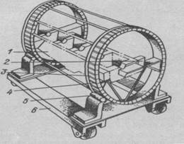 Примером может служить поворотное передвижное приспособление на линии общей сборки двигателей (рис. 7). Картер 1 двигателя устанавливают и закрепляют на кронштейнах 2, приваренных к ободьям 3, связанным тягами в виде барабана. Барабан, опираясь на валики 5, вращается на роликах 4, и его можно повернуть на любой угол. Приспособление смонтировано на тележке 6, что дает возможность сравнительно легко его передвигать.