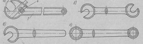 Рис. 10. Гаечные ключи: а - разводной; б - двусторонний открытый; в - односторонний открытый; г - двусторонний накидной