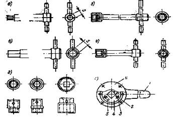 Рис. 12. Гаечные торцовые ключи: а - с наружным шестигранником; б - с внутренним шестигранником; в - с наружным квадратом; г-с внутренним квадратом; д - сменные головки; е - фрикционный ключ.