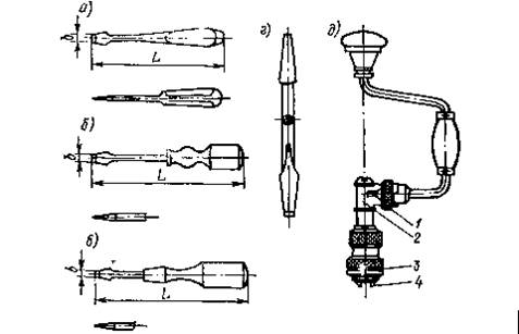 Рис. 15. Слесарно-сборочные (монтажные) отвертки: а - цельнометаллические с деревянными накладными щеками; б - с металлической пяткой; в - с диэлектрической ручкой; г - сменный наконечник-отвертка; д - трещоточный коловорот: 1 - кольцо-переключатель; а - механизм сцепления; 3 - патрон; 4 - кулачки патрона.
