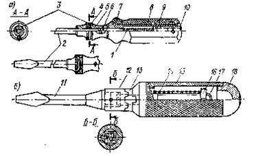 2. Тарированные отвертки позволяют завинчивать винты и шурупы с определенным заданным усилием. Отвертка 11 (рис. 16, б) закреплена во втулке 12 при помощи штифта и пружины (см. сечение Б - Б). Втулку 12, сухарь И рукоятку 15 соединяет винт 17. Рукоятка закрывается колпаком 18. Зубцы втулки находятся в зацеплении с зубцами сухаря, соединенного со шпоночным пазом рукоятки. Сжимая или ослабляя пружину 14 гайкой 1б, регулируют отвертку на заданный крутящий момент. При достижении заданного усилия затяжки сухарь отжимается, выходит из зацепления с зубцами втулки и отвертка 11 поворачиваться не будет.