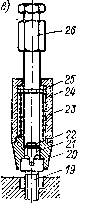 3. Механизированные отвертки рабочее движение получают от гайковерта, гибкого валика, дрели или от шпинделя сверлильного станка. Такие отвертки состоят из головки 20 (рис. 16, в), имеющей направляющую выточку для головки винта 19, собственно отвертки 21, соединенной при помощи заклепки 22 с хвостовиком 2б. Последний соединяется с приводом. Головка резьбой соединена с корпусом 23, в котором размещены пружина 24 и упорные полукольца 25. Винт направляется головкой отвертки в отверстие детали, и производится завинчивание. Утомительной операцией является завинчивание мелких винтов, особенно если эта работа выполняется с применением ручных инструментов. В приборостроении разработано много различных конструкций электромеханических отверток. Некоторые из них подвешиваются на специальные стойки и приводятся в движение от электродвигателя; с помощью гибкого вала вращение передается червячному редуктору и шпинделю отвертки. В последнее время операция завинчивания мелких винтов и шурупов не только механизируется, но и автоматизируется.