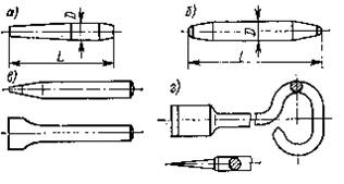 Рис. 17. Оправки и скребки: а - конусные оправки; б - проходные оправки; в - скребки для очистки поверхностей; г - скребки для снятия заусенцев.