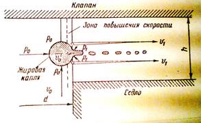В каждом гомогенизирующем клапане имеется место резкого изменения сечения потока на переходе из клапана седла в клапанную щель, а следовательно, и место резкого изменения скорости. На подходе к щели скорость потока равна V0 , а при входе – V1 , причем первая представляет собой величину порядка нескольких метров в секунду, а вторая – несколько сот метров в секунду.