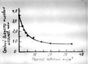 , продолжает проходить через пограничное сечение и постепенно отдать свой материал вновь образованным частицам. При большей разности V1 и V0 капля может расчленяться последовательным отрывом частиц без промежуточного растягивания всей капли в цилиндр или шнур. При малой разности V1 и V0 вся капля может миновать пограничное сечение, не успев расчлениться, но окажется деформированной до неустойчивого состояния, поэтому возвращение ее к первоначальному виду в условиях потока в щели окажется невозможным. Под механическим действием потока и сил поверхностного натяжения произойдет расчленение капли на более мелкие частицы. Такое толкование механизма дробления капель объясняет экспериментально установленную зависимость степени дисперсности эмульсии от скорости в начале клапанной щели. Чем выше скорость V1, тем интенсивнее вытягивается жидкая нить из капли в пограничной зоне, тем тоньше эта нить и мельче частица после ее распада. Зависимость дисперсности от скорости V1 объясняет связь, установленную практикой между эффектом гомогенизации и давлением, т.к. для любых данных условий скорость определяется давлением гомогенизацией. Это позволяет с достаточным основанием построить для любого гомогенизатора зависимость дисперсности гомогенизированной эмульсии от перепада давления ∆р, которое действительно для других гомогенизаторах такого же типа при условии работе на продукте с теми же свойствами. График на рис.2 показывает как зависит от давления гомогенизации дисперсность натурального молока при температуре гомогенизации 60