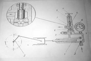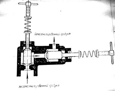 Молоко при ходе плунжера влево проходит через всасывающий клапан 3 в цилиндр, а при ходе плунжера вправо проталкивается через клапан 4 в нагнетательную камеру, на которой установлен манометр 10 для контроля давления. Далее молоко по каналу в головку 5,в которой поджимает клапан 7, прижимаемый к седлу 6 пружиной 8. Натяжение пружины регулируется винтом 11. Клапан и седло притерты друг к другу. В нерабочем положении клапан плотно прижат к седлу пружиной 8, которая стала регулировочным винтом 11, а в рабочем, когда нагнетается жидкость, клапан приподнят давлением жидкости и находится в «плавающем» состоянии. Характерным показателем режимы гомогенизации, играющим большую роль при регулировке машины, является давление гомогенизации. Чем оно выше, тем эффективнее процесс диспергирования. Давление регулируют винтом 11, руководствуясь показаниями манометра 10. При завинчивании винта давления пружины на клапан увеличивается следовательно, высота клапанной щели увеличивается. Это приводит к увеличению гидравлических сопротивлений при движении жидкости через клапан, т. е. к увеличению давления, необходимого для проталкивания данного количества жидкости.