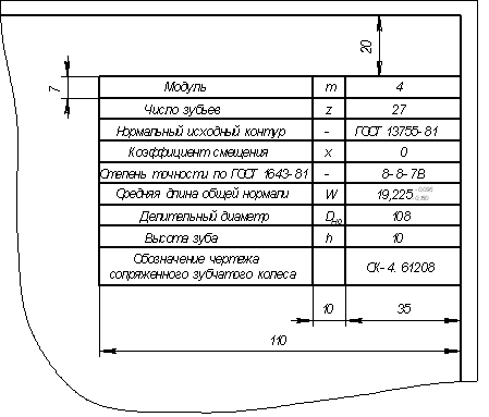 Параметры для шестерни должны быть занесены в таблицу на расстоянии 20 мм от верхней рамки. Параметры и размеры таблицы для шестерни представлены на рисунке 3.1
