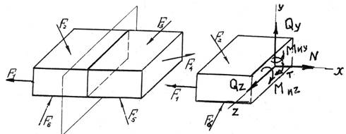 Со стороны отброшенной части тела на оставшуюся действуют распределенные по сечению внутренние силы. Из уравнений (5.1) и (5.2) можно выразить через внешние силы не закон распределения внутренних сил, а только их равнодействующие. В общем случае систему внутренних сил можно привести в точку к одной силе (главному вектору) и к одной паре сил (главному моменту). Выберем систему координат осей x , y , z с началом в центре масс сечения (рис. 5.1, б). Ось x направим по нормали к сечению, а оси y и z расположим в его плоскости. Составляющие внутренних сил определим из уравнений (5.1).