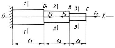 Пример . Определить внутренние силы и напряжения в поперечных сечениях участков с длиной ℓ1 , ℓ2 , ℓ3 , а также перемещения точек приложения внешних продольных сил F 1 , F 2 и F 3 ступенчатого стержня (рис. 7). Модули упругости материала участков E 1 , E 2 , E 3 и величины поперечных сечений постоянны по длинам участков и равны соответственно A 1 , A 2 ,A 3 .