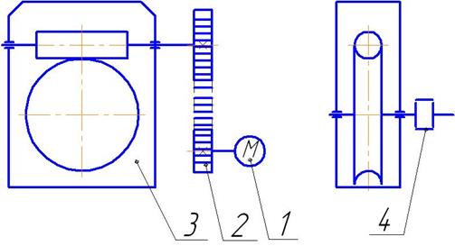 1 – двигатель; 2 – клиноременная передача; 3 – червячная передача; 4 – муфта
