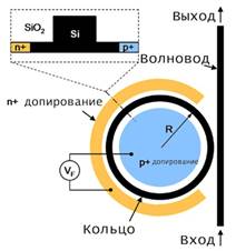 Теперь расскажем о механизме о модуляции света электроникой. Кольцо-модулятор расположено на на поверхности из отрицательно допированного кремния, а внутри кольца - область с положительным допированием (см. рис. 1). Поэтому волновод представляет собой зону раздела между p и n областями p-n диода, образованного структурой волноводов и полупроводников.