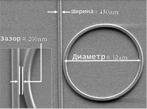 В основу нанофотонного модулятора лег кольцевой резонатор, который отстоит от прямого светового волновода на 200 нанометров (см. рис. 1). Свет, проходящий через прямой отрезок волновода, множество раз огибает кольцевой резонатор. Явление это широко известно и используется в фотонных устройствах. Причем от диаметра кольца напрямую зависит длина волны светового пучка на выходе из резонатора. Ученые использовали диаметры 10 и 12 микрон и получили свет с длиной волны 1555 нм и 1576 нм соответственно. Свет с такой длиной волны лежит в инфракрасном диапазоне длин волн.