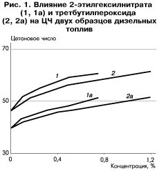 Товарный ассортимент таких присадок составлен преимущественно алкилнитратами. В Европе и США, несмотря на обилие товарных наименований, это исключительно 2-этилгексилнитрат, в России — изопропилнитрат (ИПН) и более эффективный циклогексилнитрат (ЦГН). Другой тип присадок в качестве активного компонента содержит органические пероксиды. В настоящее время пероксидные присадки вызывают большой интерес, а в Калифорнии, где введены жесткие ограничения на содержание азота в дистиллятных топливах, они находят промышленное применение. По эффективности присадки обоих типов близки между собой (см. рис. 1), хотя пероксиды все же несколько уступают нитратам [4].