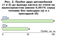 Дизельные топлива со сниженным содержанием серы характеризуются плохими противоизносными свойствами. В результате уже через 5 тысяч километров пробега выходят из строя топливные насосы высокого давления. Считается, что при содержании серы в топливе менее 0,05% требуется применение специальных противоизносных присадок, позволяющих на порядок продлить срок службы топливной аппаратуры (см. рис. 2).