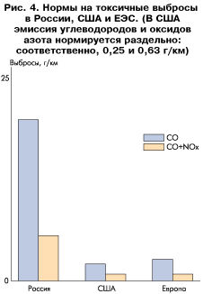 Отечественный ассортимент моющих присадок пока представлен присадками «первого поколения», отмывающими карбюратор. Это присадки «Автомаг», Неолин-1. По эффективности они находятся на уровне соответствующих зарубежных образцов. Однако, несмотря на многочисленные усилия разработчиков топлив и техники, широкого применения они не нашли. Это объясняется не только недостаточной культурой применения топлив, но и тем, что рядовому потребителю использование моющих присадок экономически невыгодно, а государственная поддержка без использования механизмов, отработанных за рубежом (налоговая и акцизная политика, дотации производителям более качественных топлив и пр.), не эффективна. Действующие в России нормы следует признать очень мягкими по сравнению с США и странами Европы (рис. 4).