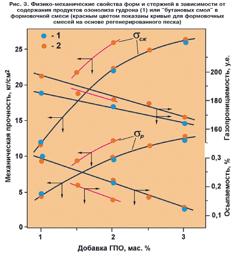 Увеличение количества продуктов озонолиза нефтяных смол, добавляемого к сыпучему минеральному материалу, например песку, до 1 мас.% и более с последующим увлажнением, перемешиванием и сушкой приводит к отверждению смеси. Это позволяет использовать такие продукты в качестве органических крепителей для приготовления форм и стержней в литейном производстве [2, 13]. В литейном цехе НПО «Полюс» (г. Томск) были испытаны в этом качестве водорастворимые натриевые соли полифункциональных кислот, полученные в виде порошка из продуктов озонолиза гудрона западносибирской нефти и осажденной из последнего сжиженным бутаном фракции «бутановых смол» [14]. При этом расчетное количество сухого порошкообразного крепителя добавляли к формовочному песку марки 1КО16, смесь тщательно перемешивали до и после ее увлажнения (4-5 мас.% воды) и из полученной сырой массы формовали цилиндрические образцы для измерения их физико-механических характеристик согласно ГОСТ 23409. Перед измерениями образцы сушили в термошкафу в течение 3 ч.