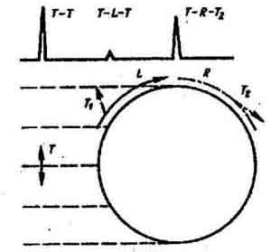 Обегание дефекта волнами [3]. Падающая волна возбуждает волны различного типа, распространяющиеся вдоль поверхности дефекта. Например, когда на округлый дефект (цилиндр) падает поперечная волна Т (рисунок 4), возникают головные продольные волны L, головные поперечные и квазирэлеевские волны. Последние две волны практически неотличимы по скорости и показаны как волна R. Скорость распространения этих волн зависит от диаметра цилиндра и расстояния от его поверхности.