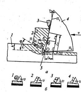 Основным режущим элементом любого инструмента является режущий клин (рис. 1.1, а). Его твердость и прочность должны существенно превосходить твердость и прочность обрабатываемого материала, обеспечивая его режущие свойства. К инструменту прикладывается усилие резания, равное силе сопротивления материала резанию, и сообщается перемещение относительно заготовки со скоростью ν. Под действием приложенного усилия режущий клин врезается в заготовку и, разрушая обрабатываемый материал, срезает с поверхности заготовки стружку. Стружка образуется в результате интенсивной упругопластической деформации сжатия материала, приводящей к его разрушению у режущей кромки, и сдвигу в зоне действия максимальных касательных напряжений под углом φ. Величина φ зависит от параметров резания и свойств обрабатываемого материала. Она составляет ~30° к направлению движения резца.