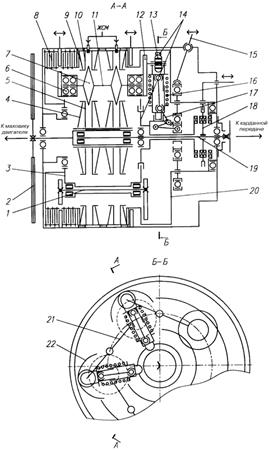 Принципиальная схема автоматической бесступенчатой коробки передач автомобиля на основе нового адаптивного вариатора представлена на рис. 1. На этой схеме вариатор включает всего два ряда центральных фрикционных дисков – внешних 10 и внутренних 5 с зажатыми между ними сателлитами 7 при помощи тарельчатых (или просто плоских дисковых) пружин 4 и 9, соответственно. Однако по схеме понятно, что этих рядов может быть сколь угодно много, сколько выдержат по прочностным и жесткостным показателям оси сателлитов 11, и их подшипники 6. Не исключаются и промежуточные поддерживающие опоры на осях 11, преимущественно при числе рядов выше четырех. Число сателлитов в одном ряде преимущественно шесть, хотя для мощных устройств с малым диапазоном варьирования их может быть до 12. Подшипники 6 осей 11 находятся на одном конце поворотных рычагов 21, на других концах которых размещены противовесы 12, одна группа которых снабжена роликами 13, находящимися в фасонных прорезях 22 диска 14, связанного с выходным валом 19.