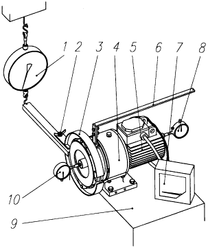 Рис. 2. Схема испытаний мотор-вариатора: 1 – динамометр растяжения; 2 – регулировочный винт; 3 – нагрузочный тормоз; 4 – вариатор; 5 – асинхронный электродвигатель; 6 – рычаг регулятора адаптивности; 7 – амперметр; 8 и 10 – тахометры; 9 – станина