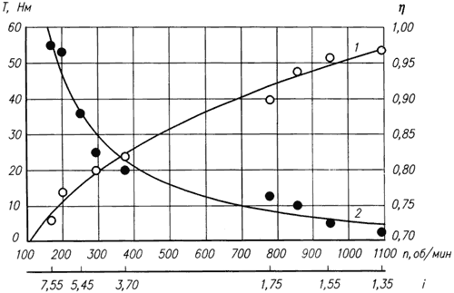 На малых передаточных отношениях КПД данного вариатора благодаря его планетарной схеме, стремясь к 100% при передаточном отношении равном единице, очень высок, что особенно важно для автомобильной трансмиссии. Следует заметить, что КПД опытного образца вариатора, мощность которого в десятки раз меньше мощности передаваемой автомобильной коробкой передач, естественно, меньше, чем полноразмерной конструкции. К тому же смазка здесь осуществлялась погружением, что для планетарных передач неэкономично, и в вариаторной коробке передач она заменена струйной подачей жидкого смазочного материала (ЖСМ). Тем не менее, при малых передаточных отношениях – от 1,3 до 2, что соответствует частотам вращения n = 1100...700 об/мин, КПД изменяется от 0,96 до 0,90, что достаточно много. Значение КПД, равное η = 0,75, достигается при передаточном отношении равном i = 7, что соответствует троганию с места автомобиля. Для реальной полноразмерной конструкции, значения КПД при высшем передаточном отношении ожидается около 0,80...0,85.