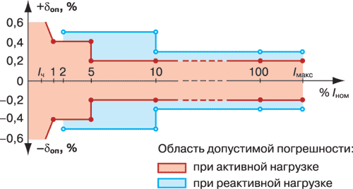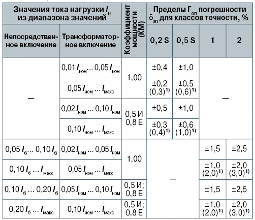 Согласно [2], класс точности счетчика определяется как число, равное пределу основной допускаемой погрешности, выраженной в форме относительной погрешности оп в процентах, для определенных значений тока нагрузки Iн в диапазоне от 0,1 Iб (Iб – базовый ток, т.е. значение тока, являющееся исходным для установления требований к счетчику с непосредственным включением) до Iмакс (Iмакс – наибольшее значение тока, при котором счетчик удовлетворяет установленным требованиям точности) или от 0,05 Iном (Iном – значение тока, являющееся исходным для установления требований к счетчику, работающему от трансформатора) до Iмакс – установленном диапазоне измерений – при коэффициенте мощности, равном 1 (в том числе в случае многофазных счетчиков – при симметричных нагрузках), при испытании счетчика в нормальных условиях (с учетом допускаемых отклонений от номинальных значений), установленных в стандартах, определяющих частные требования.