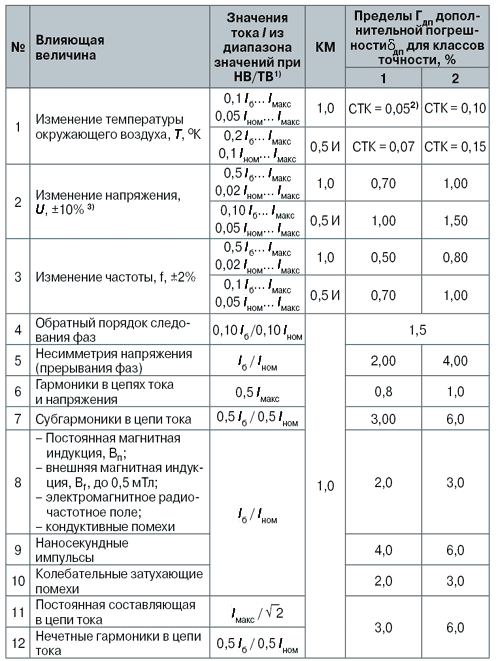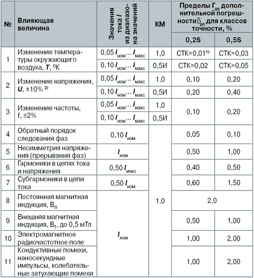 Таблица 4. Пределы допускаемой дополнительной погрешности для счетчиков классов 1 и 2