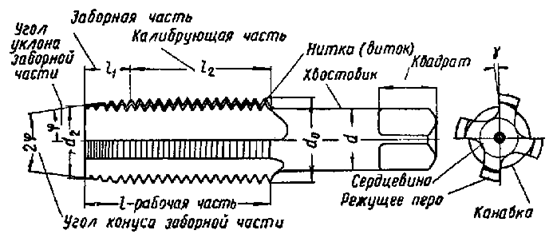 l = 5…10, такая заточка обеспечивает отвод стружки в направлении подачи метчика.