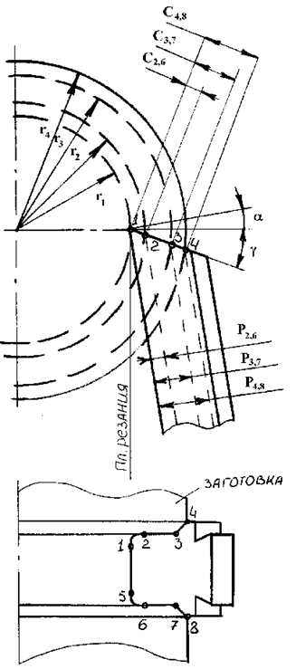 На высоте центра Он вращения детали распологается та узловая контурная точка 1 фасонного профиля режущего лезвия, которая лежит на наименьшем радиусе r1. Расположение остальных узловых точек определяется пересечением передней поверхности резца с окружностями детали радиусами r2, r3, r4. (Рис. 2)