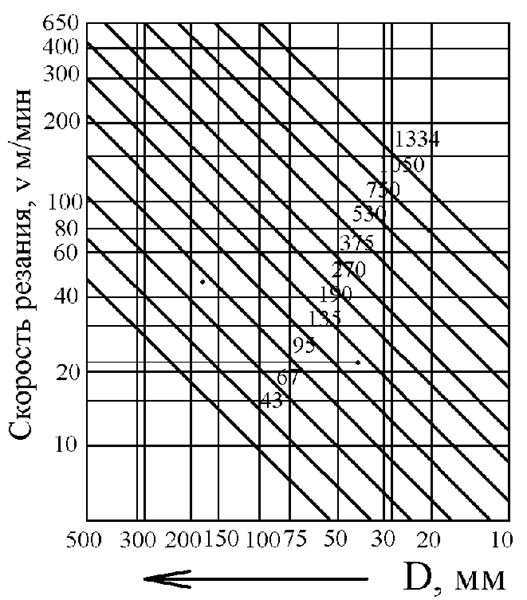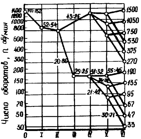 На нулевой вал (вал электродвигателя) наносится логарифмическая шкала частот оборотов в интервале, охватывающем минимальные и максимальные частоты оборотов, которые могут иметь место на валах коробки скоростей. Обычно ориентируются по наименьшим и наибольшим оборотам шпинделя и оборотам вала электродвигателя. Масштаб шкалы выбирается таким, чтобы график оборотов удобно разместился на выбранном формате листа и был чётким. На шкале наносим числа частот.