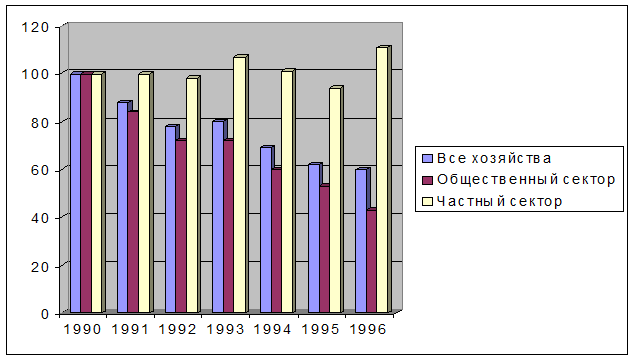 Как видно, по отношению к 1990 году, урожайность всех основных видов продукции растениеводства снизилась, что вместе с сокращением посевных площадей привело и к уменьшению валового сбора.