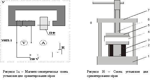 На рисунке 1а изображена магнито-электрическая схема установки. Здесь У - сама установка, на которой, собственно, и идет ориентирование зерен и прессование брусков; ПФ - пресс-форма; УИП-1 - универсальный источ-ник питания. В универсальный источник питания входит выпрямитель, реостат R для изменения напряжения на электромагните установки, а также амперметр А и вольтметр V для контроля за подаваемым напряжением.