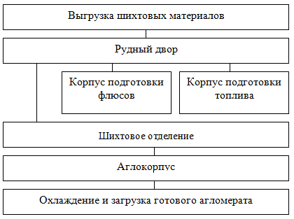 агломерационный цех №1 и №2 - задача: из исходных материалов создать шихту. Материалы загружаются в бункера, не смешиваясь, затем рассчитывают дозировку и смешивают компоненты в смесителе, который крутится на опорных роликах, после смесь подаётся в агломерационные корпуса площадью спекания 312 м2. При спекании создаётся воздуходувный слой, затем происходит зажигание, а после спекание ( самостоятельный процесс ). После разгрузки производят отсев кусков на грохоте, затем охлаждение до 60-80 0С и повторный отсев. Дальше отправление в доменный цех.