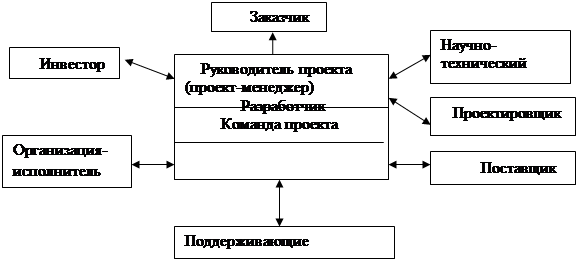 Основные участники инновационного проекта. Реализация замысла инновационного проекта обеспечивается участниками проекта. В зависимости от вида проекта в его реализации могут принимать участие от донной до нескольких десятков (иногда сотен) организаций. У каждой из них свои функции, степень участия в проекте и мера ответственности за его судьбу. Вместе с тем все эти организации в зависимости от выполняемых ими функций принято объединять в конкретные группы (категории) участников проекта. Схематическое изображение основных участников проекта приведено в рис. 2.