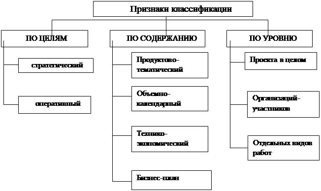 Планы могут детализироваться по уровню проекта (степени охвата работ проекта): план проекта в целом, планы организаций – участников проекта, планы отдельных видов работ (этапов, стадий, основных вех). План проекта в целом называется сводным или комплексным и охватывает все работы проекта. Планы отдельных организаций- участников (поставщиков, инвесторов, исполнителей) или отдельных видов работ (план НИОКР, бюджет проекта, план поставок и т.д.) являются частными или детальными. Содержательно планы подразделяются на продуктово-тематический, календарный, технико-экономический (ресурсный) и бизнес-план.