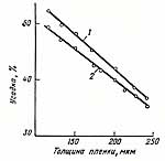 Повышение производительности ведет к возрастанию усадки в продольном направлении, в то время как поперечная усадка остается практически неизменной. Как правило, увеличение толщины пленки приводит к снижению усадки (см. рис.5). Это особенно заметно при толщинах продукта более 100 мкм и часто объясняется тем, что увеличения толщины достигают снижением скорости вытяжных валков или повышением производительности экструдера. Кроме того, даже при постоянной производительности, большая теплоемкость толстых пленок удлиняет время (снижает скорость) охлаждения, что приводит к усилению релаксационных обратимых деформаций в полимере. Отмечено влияние формы рукава на усадку пленок. Так, для рукавов «бочкообразной» формы типична высокая скорость поперечного растяжения и, следовательно, большая поперечная усадка получаемой пленки, которая часто преобладает над продольной. Поперечная усадка снижается при переходе к конической форме рукава, что способствует получению изотропных по усадке пленок.