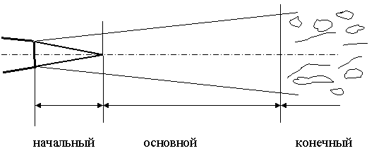Начальный участок имеет небольшую протяженность (до 10 диаметров сопла) и практического интереса не представляет. Конечный участок также не представляет интереса и может быть использован в оросительных системах. Наибольшее практическое значение имеет основной участок. Его длина зависит от диаметра сопла и давления перед ним.