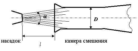 Расстояние насадка l от камеры смешения и ее диаметр определяется углом расширения начального участка струи. Правильно определенные параметры позволяют получить к.п.д. водовоздушного эжектора (до 0,25). Даже небольшое отклонение этих параметров от оптимальных в несколько раз снижает к.п.д.