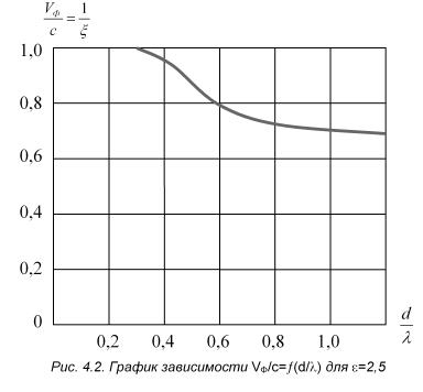 Определим коэффициент замедления волны ζ в диэлектрике стержневого излучателя по рис. 4.2: