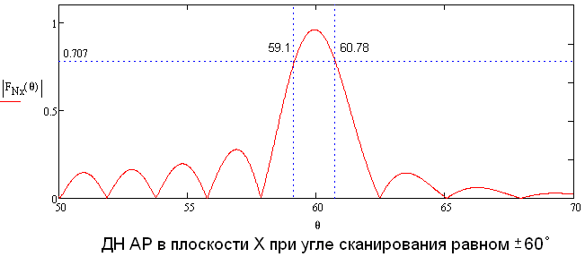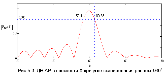 Вид диаграммы направленности антенной решетки в плоскости Х при угле сканирования равном ± 60° (рис.5.3)