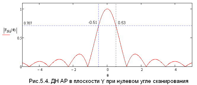 Вид диаграммы направленности антенной решетки в плоскости Y при нулевом угле сканирования (рис.5.4):