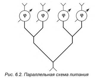 Недостатком параллельной схемы является сложность согласования при делении мощности на большое количество излучателей.