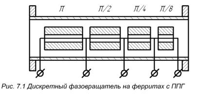 Длина дополнительного участка линии определяет дискретное значение фазового сдвига, а количество таких дополнительно включаемых линий определяет максимальный сдвиг фазы. Одна из возможных реализаций конструкции вышеописанного фазовращателя приведена на (рис. 7.1). В нашем случае будем применять дискретно-коммутационный ферритовый фазовращатель на прямоугольной петле гистерезиса с дискретом фазы равным 22, 5°.
