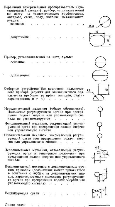 Изображение приборов и средств автоматизации на схемах производится в соответствии с ГОСТ 36—17—77 «Обозначения условные в схемах автоматизации технологических процессов». Стандарт устанавливает условные графические обозначения приборов и средств автоматизации, а также обозначения измеряемых величин и функциональных признаков приборов.